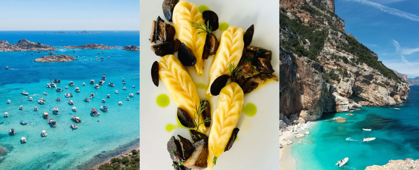 The next course is an amuse-bouche – a grilled scallop served à la Catalana, with thinly sliced seasonal vegetables. After that, comes traditional culurgiones pasta – dumpling-like parcels – filled with smoked potato, pecorino, dill and chives, served with goats’ cheese which is a Sardinian staple. The fourth course is perhaps my favourite to prepare. It’s another kind of Sardinian pasta – fregola – which I make using semolina flour. It recreates the look of couscous, while tasting completely different. I cook it like a risotto, adding fresh seafood like clams, mussels, octopus, squid; whatever the fishermen have caught that day. For the main course, I cook lamb in a cacciatore sauce with forest-foraged flavours like mushrooms, olives and capers, finished on the barbecue to give all that richness a smoky, outdoorsy edge.